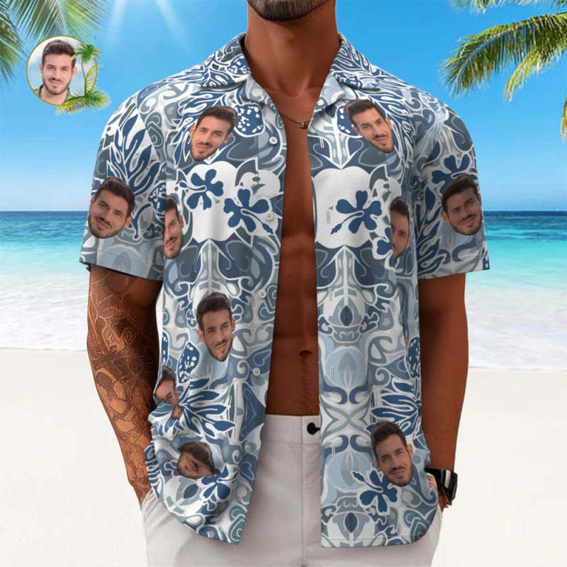 Camisa Hawaiana Con Cara Personalizada, Camisa Aloha Con Estampado Integral Para Hombre, Regalo - Patrón Vintage Azul