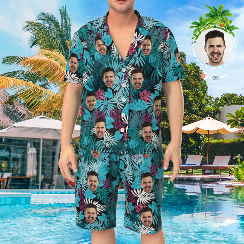 Conjunto De Pijama Personalizado Con Cara, Ropa De Dormir De Manga Corta, Ropa De Dormir Abotonada - Courful Leaves