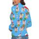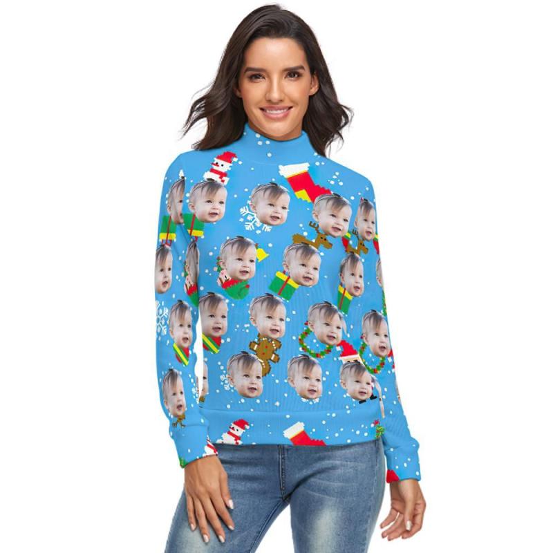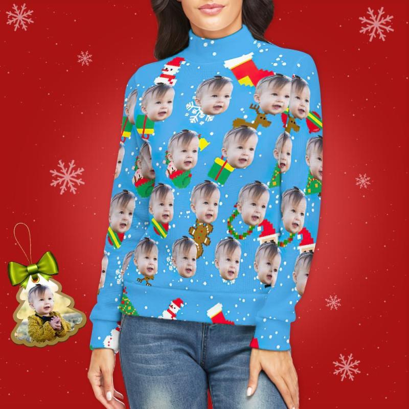 Cuello Alto De Cara Personalizada Para Mujer Suéter Feo De Navidad Suéteres Sueltos De Punto - Azul Hielo