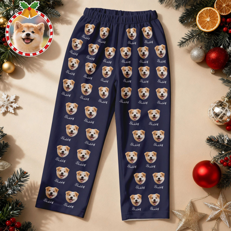Pijama Navideño Azul Personalizado Con Cara De Mascota. Pijama De Manga Larga Personalizado Para Perro Y Gato Con Nombre. Regalo Perfecto Para Los Amantes De Las Mascotas.